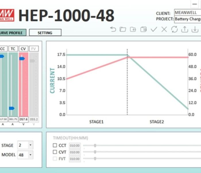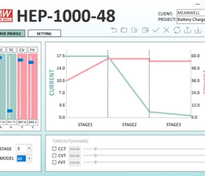 Mittels der Programmieroberfläche des HEP-1000-48 kann die Ladestrategie von einer 3-Stufenladung auf eine 2-Stufenladung umgestellt werden, wodurch eine Anpassung an Lithium-Akkus ermöglicht wird. Um eine 20 Ah LiFePO4-Batterie mit einer maximalen Ladespannung von 56 V DC zu laden, können die Optionen „CV“ und „CC“ auf 56 V DC und 17,5 A eingestellt werden, um eine schnelle Ladung zu gewährleisten. Darüber hinaus besteht die Möglichkeit, den Ladestrom zu verringern, um eine Überhitzung zu vermeiden, und die Ladespannung zu senken, um eine Überladung zu verhindern.