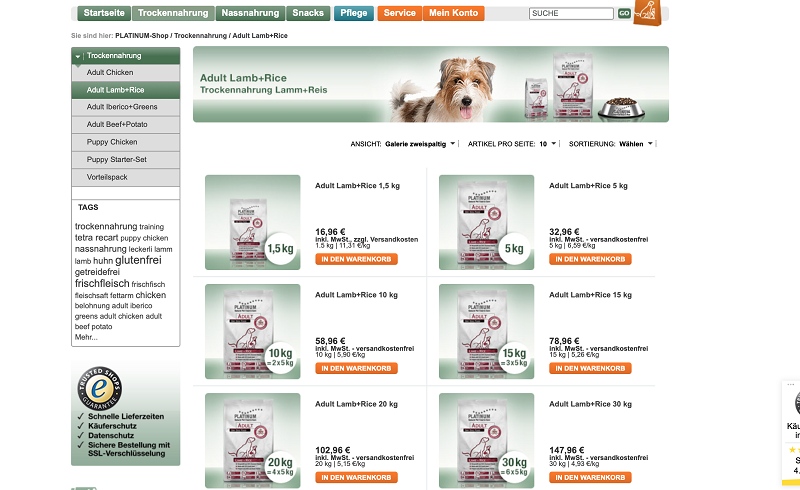 PLATINUM bietet die Futtersäcke in 5 kg Einheiten an. Je höher die Abnahmemenge, desto günstiger werden die Produkte. Wir haben für diesen Trockenfutter Test 10 kg zu 58,96 € bestellt. Ab 19,00 € erfolgt die Lieferung bei PLATINUM kostenfrei. Bereits nach 2 Werktagen kam die Lieferung bei uns an. PLATINUM verkauft die eigenen Produkte im Direktvertrieb. Für PLATINUM Kunden bietet das unter anderem den Vorteil der 100 Tage 100% Geld-zurück-Garantie.